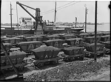 The Carrington coal port used twelve hydraulic cranes powered by water under pressure supplied from a pumphouse nearby.[101] There were also three steam cranes, which had been relocated from Queens Wharf.[57] In 1890, this government-operated facility was capable of loading a total of 12,000 tons per day. The first electric cranes were commissioned at the Basin, in 1916, but at the end of that year needed to be shutdown for a short time, while the power supply was improved. By mid 1917, there were six electric cranes there.[102][103][104]