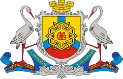The big coat of arms of Kropyvnytskyi adds to this two supporters: silver storks set on the compartment made up of four wheat ears and a dark blue scroll with a motto in Ukrainian: "З миром і добром" (English "With peace and good").