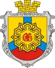 Its basic element is a cartouche-decorated Spanish shield bearing the symbols found on the current flag of Kirovohrad and topped with a golden mural crown. The shield follows the colours of the flag and is divided into three parts by a reversed dark blue pall, the first and the second fields being yellow and the third being crimson. Overall there is a yellow six-bastioned fort one point up superimposed by the red monogram of St. Elizabeth.