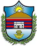 The elegant shape of the escutcheon or shield is a combination of two distinct designs, the top, with its three tips is from a Swiss design, the bottom with the tip issuing out from the middle is from a French design. The shield is embraced by an olive branch with 45 leaves on either side, (a total of 90 leaves) a symbol of peace. It has a tincture of azure, but in variant versions the field changes of tincture on both chief and base; in the modern version, the azure or blue represent Magdalena River and the Caribbean Sea. The shield is divided in two by a horizontal band which bears the flag of the Department of Magdalena in the background and in front of it the National Pantheon which is a structure located in Magdalena in the Quinta de San Pedro Alejandrino that honours the Libertador and the fallen heroes of the nation, the superimposition of the structure on the flag symbolizes the integrity and firmness in the souls of the Magdalenenses as well as keeping alive his dream. On chief, that is the part that is on the top, bears the Sierra Nevada de Santa Marta with the radiant sun issuing from behind. The official blazon calls for a snow topped mountain as it would look naturally, i.e. proper, but this leaves the possibility of a representation of the base and hill of the mountain to be coloured green or brown as both are natural colours for mountains. The blazon also calls for a river in vert or green, which is supposed to represent the Magdalena River, this being a more natural representation of the river as it waters are far from being the typical blue shown in heraldry, this however, has been left out of the modern representations of the coat of arms, choosing instead to attribute the blue background as the river. Both of these geographical features represent their importance to the region, its extreme geography going from sea level to 5,775m above sea level, as well as the natural resources it possesses, and additionally the green of the river the hope that its inhabitants have of the department taking a national leadership position, the sun symbolizes their nobility and wisdom. The base has a Tayrona golden pendant, a typical and iconic piece of the culture of the Indigenous peoples of Magdalena.