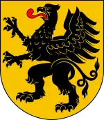 The coat of arms of the Pomeranian Voivodeship, Poland consists of a yellow (golden) Iberian style escutcheon, depicting a black griffin, standing on its back feet, with its front legs and winds rose, a red tongue put out from its opened beak, and a tail that splits into two in middle of its length. The design of the griffin was based on the 16th century fresco located in the Oliwa Cathedral in Gdańsk.[40][41]