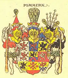 Above the shield, were placed three helmet. Above the top left field was placed a helmet with a ducal crown and a flat hat made out of a spiked top, made out of the ermine fur, with a large plume of peacock feathers on top, which represented the Principality of Rügen. The mantling, a drapery tied to the helmet, was black and yellow (golden). Above the top middle field was placed a helmet with a crown and a pointed hat with a small plume of peacock feathers, which represented the Pomerania-Stettin. The mantling of the helmet was red and blue. Above the top right field was placed a helmet with a crown and hat with a lily stems and a small plume of peacock feathers, which represented Pomerania. The mantling of the helmet was red and white (silver). On the sides of the shield were the supporters, in the form of creatures holding it. Originally they were a griffin and a lion. Not long after they were replaced by two wild men, figures depicting male humans wearing oak leaves around their hips, and holding clubs.[1]