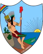 The coat of arms was established in the Law of the National Flag, Shield and Anthem (Ley de Bandera, Escudo e Himno Nacionales), passed on February 17, 1954, by the military governor of Venezuela, Marcos Pérez Jiménez. The shield is divided in the colors of the national flag. In the dexter chief, on a red field, wheat represents the union of the 24 states of the Republic existing at the time and the wealth of the nation. In sinister chief, on a yellow field, weapons (a sword, a sabre and three lances) and two national flags are tied by a branch of laurel, as a symbol of triumph in war. In base, on a deep blue field, a wild white horse (representing Simón Bolívar's white horse Palomo) runs free, an emblem of independence and freedom.