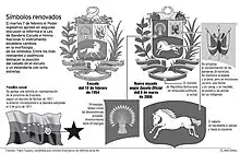 On March 7, 2006, the National Assembly approved changes to the coat of arms and the flag of Venezuela, which were made official on March 12, 2006, coinciding with Flag Day. Prior to 2006, the horse was running to the sinister side of the shield with its head turned to the dexter (to the viewer, this appears as the horse galloping towards his right and looking back to the left). In heraldic practice, animals and beasts are to appear facing to the dexter, which is considered the natural and honorable position. The Economist observed that Hugo Chávez ordered the seal changed after his daughter, Rosinés Chávez Rodríguez, had described the previous horse as “looking backwards”.[1] Government supporters state, however, that even if the president's daughter was the one who sparked the discussion, both the legislative and executive branch agreed to changes. These were adding a machete to represent the peasant fighters during the revolutionary wars in Venezuela since the War of Independence, and a bow and arrow as a tribute to the brave indigenous population who resisted the Spanish conquistadors.