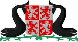 Quartered: I gules a sinister lion of silver, II in silver a lion of gules, III in silver a sinister lion of gules, IV in gules a lion of silver. Supporters: two whales of natural color, the tails up. All placed on an arabesque of vert.