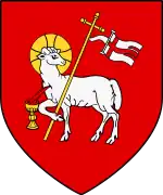 The bottom part of the coat of arms is divided vertically into two fields. The left field features the Lamb of God, in a form of a white (silver) sheep with a yellow (golden) circular aureola with a red cross within it, behind its head. In its front right hove, it holds a yellow (golden) cross with a white (silver) banner with red cross on it, attached to it. It bleeds from its chest, with the red drops of blood falling towards a yellow (golden) chalice placed in front of it, between its legs.[1] It is based on the coat of arms of the historical region of Warmia, more precisely the Prince-Bishopric of Warmia, and the Roman Catholic Archdiocese of Warmia, with the Lamb of God being one of the regional symbols since the 14th century.[5][6]