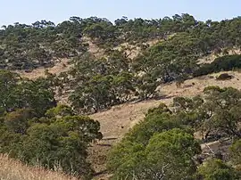 The park lies on the border between the dry northern Adelaide Plains and the wetter Mount Lofty Ranges. Based on climate measurements for nearby Parafield Airport, the park has an average rainfall of 465 millimetres (18 in), an average winter daily temperature range of 6.2—15.6 degrees Celsius and a summer range of 16.5—29.7.[7] Due to the risk of flooding after heavy rain, the park's waterways have been dammed, though they are dry for much of the year.[8] The park's topography ranges from steadily sloping in the west, to hilly in the east. Its lowest point, on the western edge along Bridge road, is 70 metres (230 ft) above sea level, rising to 215 metres (705 ft) at the Para Trigonometric Point in the park's southeastern corner. Flat land on the western side has red-brown soil with the remainder having Terra Rosas, Redzinas and fine-textured mallee soils.[9]