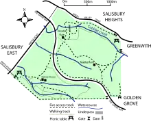 Cobbler Creek Recreation Park is a 266-hectare (657-acre) protected area located about 19 kilometres (12 mi) north of the Adelaide city centre within the suburb of Salisbury East.[4] The park is bounded by Bridge and Smith roads, and Green Valley Drive. The Grove Way, a major divided road, runs through the park with a pedestrian underpass connecting the two park sections. The park is open to the public and includes three formed walking trails and two ruins. The remains of William Pedler's home "Trevalsa" and another's called "Teakles House" lie next to one of the trails. There are no public facilities except for benches, signage and picnic tables.[5] "Kelway House", originally belonging to the Kelway Park farm that occupied much of the park, remains as office accommodation for park management staff.[6]