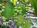 In late summer, it bears green fruit, about 2 cm (0.79 in) diameter, in large, grape-like clusters.[3] The fruit gradually ripens to a purplish color. Each contains a large pit that constitutes most of the volume of the fruit.