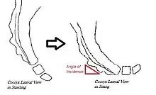 Sagittal coccygeal movement is measured using the angle of incidence—or the angle at which the coccyx strikes the seat when an individual sits down.[7] A smaller angle indicates the coccyx being more parallel to the seat, resulting in flexion (or “normal” movement) of the coccyx.[7] A larger angle indicates the coccyx being more perpendicular to the seat, causing posterior subluxation (or “backward” movement) of the coccyx.[7]