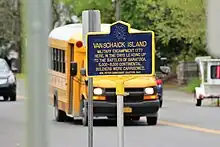 A New York State historical marker for Van Schaick Island, part of the city of Cohoes. The marker is located near the intersection of Delaware Avenue and Ontario Street.