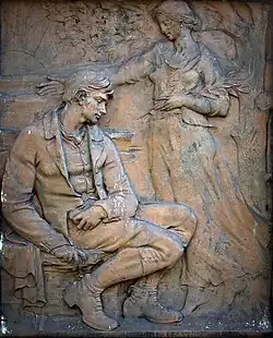 In 1914 a statue of Robert Burns by Albert Hemstock Hodge (1876-1918) was unveiled in Stirling and one of the four bronze panels on the base is that of The Poet and his Muse. The original plasterwork for this panel now hangs in the Stirling Smith Art Gallery and Museum in Dumbarton Road, Sterling.[15]
