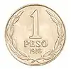 The Chilean peso (Spanish: peso chileno) currently has 6 denominations of coins, which are 1, 5, 10, 50, 100 and 500 pesos. Its subdivision is the centavo (Spanish: centavo chileno), but centavo coins were only minted until 1979. The coins were first minted in 1975.[1] The peso and centavo replaced the Chilean escudo and centesimo respectively. The latter currency were Chile's national currency from 1960 to 1975.