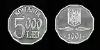 5 lei | 21 mm | 3.35 g | Nickel-plated steel | Smooth | State Title, value, oak leaves | Coat of arms, year of minting | 1992 | 1 July 2003 | 1 July 2004 |