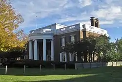 Ira C. Copley's mansion was designed in 1906 by Jarvis Hunt, an architect from Chicago and finally completed in 1917. It is predominantly of Classical Revival design, but has many Federal Style features. The mansion is three stories tall and shaped like an "L". An ionic portico features on all sides, creating a porch that can be accessed from the ballroom. Consistent with Federal details, it has balustrades over the eaves. The main roof is hipped with a flat roof over the wings. A twin chimney emerges from the west side of the roof. The main entrance has slender pilasters and an elliptical fanlight between narrow sidelights. The exterior walls are Roman brick in a Flemish bond. The rear features a Palladian window with the lunette used to illuminate the third floor. The ballroom was located under the hipped portion of the roof.[1]