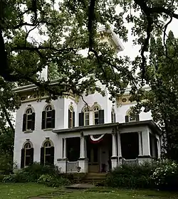 The Col. William T. and Elizabeth C. Shaw House is a historic building located in Anamosa, Iowa, United States. Shaw settled in this area in 1854, and as a building contractor was responsible for the construction of many of the commercial blocks in the central business district.[2] He was also involved in the platting of the town of Strawberry Hill, which was eventually incorporated into Anamosa, and he helped construct the Dubuque and Southwestern and the Midland Railroads in town. Shaw served as a colonel in the 14th Iowa Volunteer Infantry Regiment during the American Civil War. He had this two-story, brick Italian Villa built in 1872. It features a tall tower, bracketed eaves, low-pitched hip roof, elaborate window hoods, and tall, narrow windows. The house was listed on the National Register of Historic Places in 1992.[1]