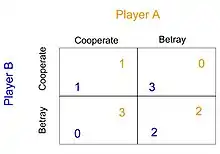 Game theory is one of the principal components of economic theory. It addresses the way individuals allocate scarce resources and how scarcity drives human interaction.[8] One of the most famous examples of game theory is the prisoner's dilemma. The classical prisoner's dilemma model consists of two players who are accused of a crime. If Player A decides to betray Player B, Player A will receive no prison time while Player B receives a substantial prison sentence, and vice versa. If both players choose to keep quiet about the crime, they will both receive reduced prison sentences, and if both players turn the other in, they will each receive more substantial sentences. It would appear in this situation that each player should choose to stay quiet so that both will receive reduced sentences. In actuality, however, players who are unable to communicate will both choose to betray each other, as they each have an individual incentive to do so in order to receive a commuted sentence.[9]