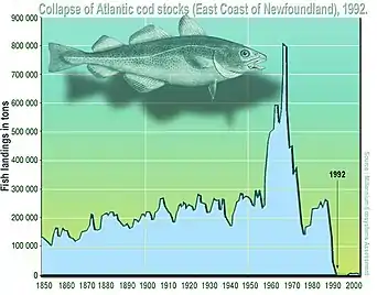 Atlantic cod stocks were severely overexploited in the 1970s and 1980s, leading to their abrupt collapse in 1992.[23]