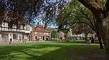 South of the Minster, the south-west side was built up with houses. Two were demolished in 1862, and College Green was created. The remainder were demolished between 1905 and 1937 in order to enlarge College Green. In 1955 the road was realigned a little further south-west and the green was enlarged,[1] while a sundial originally from Drakelow Hall was erected on the green.[3]