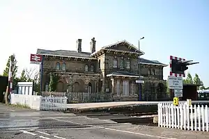 It is on the Nottingham to Lincoln Line, which was engineered by George Stephenson and opened by the Midland Railway on 3 August 1846.[2] The contractors for the line were Craven and Son of Newark and Nottingham;[2] The Grade II listed[1] station building in aggressive Italianate style is dated ca. 1848 and is thought to be by the architect I.A. Davies.[3]