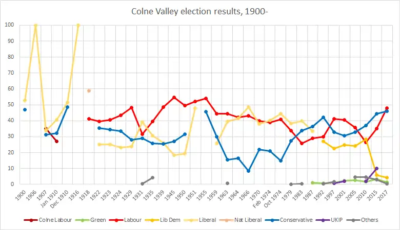 Colne Valley was one of 17 seats won (held or gained) by a Labour candidate in 2017 from a total of 22 covering its county, with Thelma Walker's 2017 win being one of 30 net gains of the Labour Party. However, former MP Jason McCartney took the seat back for the Conservatives in 2019.