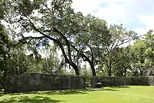 Dorchester's location made it a strategic military site.[5] Fear of a possible French invasion prompted the construction of a powder magazine and fort from 1757 to 1760.[5] Originally designed to be constructed using brick, the fort and powder magazine were eventually made of tabby, a concrete material made of lime, sand and oyster shells. While local materials were used in the construction of the fort, in design it was a simplified version of classic European fortification. The walls formed a rectangle around the magazine, with sections called half-bastions projecting from each corner. From these strong points, soldiers could direct deadly fire down the length of adjoining walls.[5] The French invasion never came, though, and the town apparently saw little activity until the American Revolution in 1775.