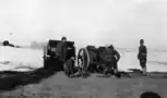 Sensing the militia's intent to act that day after seeing machine guns placed above the colony and choosing to disobey Tikas, strikers took cover in hastily constructed fire positions.[18]: 214–215 [53] Accounts of who fired the first shot differ, but fighting began or escalated after the militia at Ludlow detonated warning charges to notify Linderfelt's troops stationed at Berwind Canyon and another detachment at Cedar Hill.[10]: 220 [18]: 216 In total, some 177 militia and soldiers participated in the fighting.[18]: 221