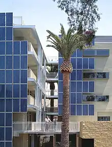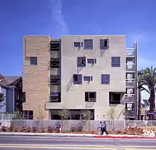 Colorado Court Housing is a 44-unit housing project designed by the architectural firm Pugh + Scarpa. Colorado Court is the first United States Green Building Council (USGBC) "LEED" certified multi-family housing project, achieving "Gold" certification. Located at the corner of a main offramp of the Santa Monica freeway, Colorado Court's highly visible position makes it gateway to the city of Santa Monica, California. The 44-unit, five-story building is the first affordable-housing project the United States to be LEED certified and is nearly 100% energy neutral (Colorado Court Movie Clip). This project is an excellent model of sustainable development in an urban environment, provides a model for private/public partnerships benefit the community, and promotes diversity in an urban environment through strategically placed affordable housing.[1]