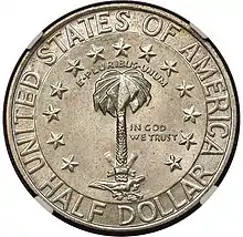 The reverse depicts a palmetto tree, the emblem of South Carolina. Arrows are tied to its base in a saltire pattern by a broad ribbon, signifying the tree's military connotation. On June 28, 1776, a British naval squadron tried to seize Fort Moultrie in Charleston Harbor. Though many shots were fired by the British ships during the Battle of Sullivan's Island, those that hit the fortifications were absorbed by the soft palmetto logs that formed it; the American death toll was 12 against hundreds of British killed by the fort's gunfire. The lopped oak branch at the palmetto's base symbolizes the oaken British vessels.[26] As Arlie Slabaugh Jr. put it in his volume on commemorative coins, "the South Carolinians had proven in 1776 that the palmetto was superior to the oak of Old England, and so it appears above the oak on this coin".[5] The 13 stars surrounding the tree ostensibly symbolize the original American states, but may also have been intended to evoke the Confederate States of America.[26][lower-alpha 2] The name of the country, the coin's face value, and the mottos required by law appear on the reverse. Davidson's initials do not appear on the coin.[27]