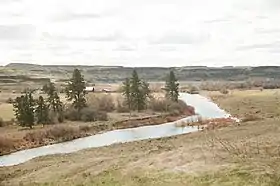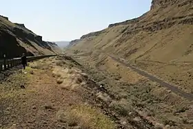 The Columbia Plateau Trail, seen to the right, drops down 400 feet (120 m) in altitude as it descends through Devil's Canyon to the Snake River.[5]