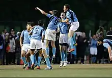The CSS boys rugby team celebrates one victory at the 2013 PSAL conference championship