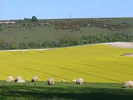 Combe Hill is a summit in Berkshire, England, with a maximum elevation of 293 m (961 ft). It lies around 1 mile (1.6 km) to the south-east of Walbury Hill, the county top of Berkshire, which is 297 m (974 ft) high. The hill is about 7 miles (11 km) southwest of Newbury on the Hampshire/Berkshire border and is part of the north-facing scarp of the North Hampshire Downs, a chalk ridge within the North Wessex Downs Area of Outstanding Natural Beauty.[1]