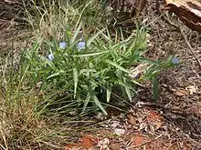 The species grows as a prostrate herb, producing roots from the stem at the nodes.[1] Flowers are bright blue with three petals, however one petal is much smaller than the others, often producing an appearance of two petals. The species prefers moist soils, but has a broad natural range, extending from coastal monsoon forest to the arid central deserts where it grows as an ephemeral following favourable rains.[1][2][4] The species has been eaten as a green vegetable by Aboriginals. European settlers also ate the plant to prevent scurvy, giving rise the common name of scurvy grass.[5]