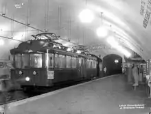 The line was officially opened by King Haakon VII on 27 June 1928.[17] It became the first underground railway in the Nordic countries, five years before Stockholm and six years before Copenhagen.[18] The tunnel was 1,620 meters (5,310 ft) long[16] and trams used three to four minutes to run through it.[17] It was used by two companies,: Holmenkolbanen and Akersbanerne, with Holmenkolbanen operating both the Røa Line and the Holmenkollen Line. The Sognsvann Line was to be connected to the tunnel from 10 October 1934, and the two companies needed to find an agreement for paying for trackage rights.[19] After negotiations failed, a decision was made by the Ministry of Labour on 7 July 1932, which stated that Akersbanerne would have to pay the additional fares collected for transport passengers through the tunnel, less the cost of running trains on the section.[20]