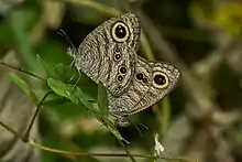Female: Differs on the upperside in having the area surrounding or bordering the ocelli on both forewing and hindwing paler, closely irrorated (sprinkled) with brown striae, the discal transverse band generally clearly defined, and very often both the tornal, and at least one of the apical, ocelli distinct. On the underside it is paler than the male, and has the subbasal, discal and subterminal transverse dark bands more clearly defined.[3][4]