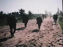 Company F consisted of a large company headquarters and operations section, three patrol platoons, a communications platoon, and a parachute rigger section. Each patrol platoon consisted of a platoon headquarters and, at full strength, six 6-man patrol teams. Company F was historically an independent company within the Michigan National Guard, but for a period during the Cold War beginning in 1983, the company was aligned with VII Corps Headquarters in Stuttgart, West Germany, where it would deploy and serve as the corps Long Range Surveillance unit in the event of a NATO-Soviet conflict in Europe. Members of Company F held military occupational specialties (MOS) in the branches Infantry, Quartermaster Corps (Parachute Rigger 92R), Signal Corps and Military Intelligence. Since it was an airborne unit, members were required to attend the Army's Basic Airborne Course at Fort Benning, GA.[1]