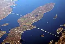 Conanicut Island is an island in Narragansett Bay in the American state of Rhode Island. The second-largest in the Bay, it is connected on the east to Newport on Aquidneck Island by the Claiborne Pell Bridge, commonly known as the Newport Bridge, and on the west to North Kingstown on the mainland via the Jamestown-Verrazano Bridge. The town of Jamestown comprises the entire island. The U.S. Census Bureau reported a land area of 24.46 km2 (9.44 sq mi) and a population of 5,622 in 2000. A tombolo connects the southern part of Conanicut to an extension of the island to the southwest.