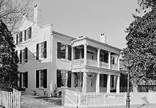 The house had its beginnings in 1822 as Mobile's first courthouse and city jail, and was built between the southern bastions of Fort Condé.[1] The fort itself was in the process of being demolished at the time. In 1849 the site was purchased by Jonathan Kirkbride from Mount Holly in New Jersey and the old courthouse and jail were converted into a kitchen wing, attached to the newly built main house.[5] The residence would remain in the Kirkbride family until 1905, when it was purchased by B. J. Bishop.[4] The site was purchased by the Historic Mobile Preservation Society in 1940 and a partial restoration was undertaken. It was during this time that the outlines of four of the old jail cells were discovered in the kitchen wing. The restoration would later be completed by The National Society of the Colonial Dames of America.[1]
