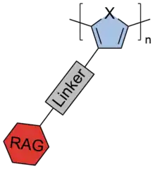 The conducting backbone is usually polythiophene or polypyrrole based. As pendant groups quinones, radicals (eg. TEMPO), and metal complexes (eg. ferrocene) have been used.[2]