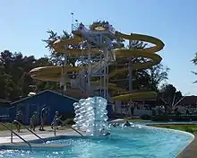 Splash City was a water park located in the middle of the park. It contained three attractions: Cliffhanger Falls, Connie Otter's Kiddie Cove, and Otter Creek River Adventure. There were also two decks on the island of the lazy river for sunbathing. They could be accessed by a bridge on the right end of the lazy river. The slides were added in 1986, and the rest of the water park was added in 1991. They operated from 1986 to 1994, 1996–2006, and 2009–2010. It sat idle from 2011 to 2016. In October 2015, the park announced Splash City would be reopening in 2016.[31] On May 28, 2016, Otter Creek River Adventure reopened to the public. On August 6, 2016, both Cliffhanger Falls and Connie Otter's Kiddie Cove reopened to the public.[24] In March 2022, Splash City was demolished. Only a portion of the Cliffhanger Falls water slide remained standing, which was later torn down.[32]