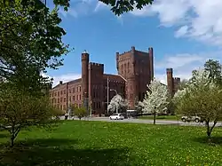 Connecticut Street Armory, also known as the 74th Regimental Armory, is a historic National Guard armory building located at Buffalo in Erie County, New York. It is sited at Columbus Park. It is a massive castle-like structure built in 1899 of Medina sandstone. It was designed by architect Isaac G. Perry. It consists of a 3+12-story administration building with an attached 2-story drill shed all constructed of sandstone, lying on a rusticated battered stone foundation. The building features 4- to 6-story towers surrounding the administration building, and a 6+12-story square tower at the center entrance. It is home to the 74th Regiment of the New York National Guard.[2] Prior to its construction, the site was home to a 13.5 million gallon reservoir.[3][4]