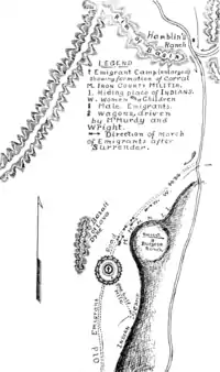 According to one report, they attempted to send a little girl to a nearby spring for water, dressed in white, and she was fired upon, but escaped unharmed back to the camp.[24] When two emigrant horsemen attempted to retrieve water, one was shot while another escaped, but not before seeing that the shooter was a white man.