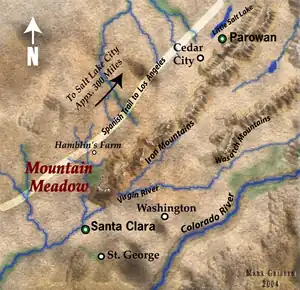 After the party was organized they left Salt Lake City on or about August 5, 1857.[2] As they passed through Utah, the emigrants were in need of supplies, but because of the possibility of war many Mormons refused to trade with them; this was one of several problems the emigrants would encounter. When passing through Provo, 40 miles south of Salt Lake City, the emigrants decided to stop and let their animals rest. An area just west of the town had been marked off, by the local settlers, as use for animal feed during the upcoming winter. The emigrants allowed their livestock to wander into this area, and after seeing this the local settlers asked the party to move on to another area a few miles to the west; even offering to help them move.[3] One of the party's leaders refused saying "This is Uncle Sam's grass...We are staying right here.", so the settlers gave them the option of fighting or leaving; the party left.[3] After camping the night, the Baker–Fancher party continued to pass through Utah over the next few weeks, arriving near Cedar City on Thursday, September 3, 1857.[4]