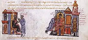 John the Orphanotrophos sends Phagitzes with relics to Constantine Dalassenos, miniature from the Madrid Skylitzes
