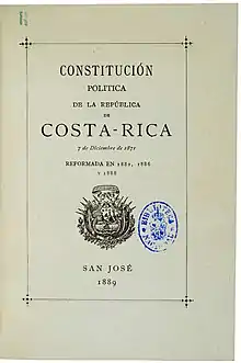 From 1838 to 1870, a large number of Constituent Assemblies with a greater or lesser degree of effectiveness, independence or legislative power were raised.[5] As is the custom in Costa Rica, after a rupture of the constitutional order that defenestrates a government, a Constituent Assembly was convened. It legitimized the new government (a custom that was maintained in 1871, 1917 and 1949). During the very unstable second half of the nineteenth century in which there were many coups d'état, the Constitutions proliferated as much as the coups, as well as their Assemblies.[5]