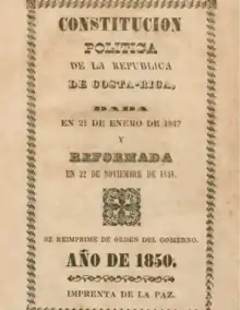 Still as part of the Federal Republic the then State of Costa Rica promulgates the Fundamental Law of the State of Costa Rica on January 25, 1825 by the Constituent Congress of the State of Costa Rica during the presidency of Juan Rafael Mora Porras and heavily influenced by the Cadiz Constitution.[1] This Constitution will be in place until Costa Rica's departure from the Federal Republic in 1839. On March 8, 1841 then dictator Braulio Carrillo Colina enacted the Decree of Basis and Guarantees, which worked as de facto Constitution on his regime.[1] and was pretty authoritarian in nature.[1] Carrillo was toppled in April of 1842 due to the invasion of Honduran general Francisco Morazán. Morazán abolished the Decree on June 6, 1842 and this was confirmed by the Constituent Assembly instituted by him on August 24, 1842.