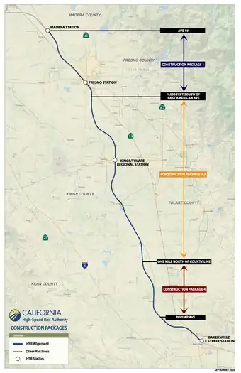 Construction Package 1 (CP 1) is 32 miles (51 km) long, running from Avenue 19 north of Madera to East American Avenue south of Fresno.[4] The contract was awarded August 16, 2013, and a Notice to Proceed was given on October 15, 2013.[3]: 12 Groundbreaking was on January 6, 2015, in Fresno.