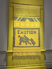 Made in 1994 of cotton, silk, and metallic thread, Virgen De los Caminos (Virgin of the Roads) is now hung at the Smithsonian American Art Museum.[20] This piece is a children's quilt with embroidered flowers, barbed wire, la Virgen De Guadalupe (a religious Mexican symbol), and almost invisible appearances of the word "Caution" accompanied by the silhouettes by John Hood that are also seen in C. Jane Run. Authors Jonathan Yorba and Cristina Serna suggest that the Virgin of Guadalupe is a guardian saint for the immigrants crossing into the United States from Mexico, with the images from Hood's road signs being embroidered in white onto the light colored fabric to express that immigrant families are ghosts, nearly invisible and somehow unnoticed by others.[20][21][22]