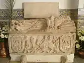A gravestone on the wall, over the sarcophagus, was installed in 1624 and reproduced part of another epigraph of 1401.[1][2]