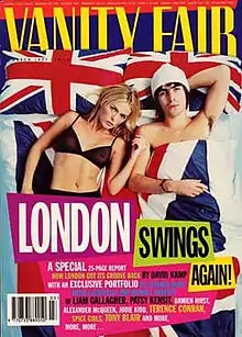 In March 1997, Vanity Fair published a special edition on Cool Britannia with Liam Gallagher and Patsy Kensit on the cover; the title read 'London Swings! Again!'.[9] Figures in the issues included Alexander McQueen, Damien Hirst, Graham Coxon and the editorial staff of Loaded. Tony Blair's speech at the 1996 Labour party conference drew on the optimism of the Euro 96 football championships – accompanied with the summer’s chart-topping anthem “Three Lions”. Alluding to the "thirty years of hurt" lyric in the song (since England last won the World Cup), Blair stated, "Seventeen years of hurt never stopped us dreaming. Labour's coming home."[15] After the Labour party won its landslide, there was even more enthusiasm.[4]